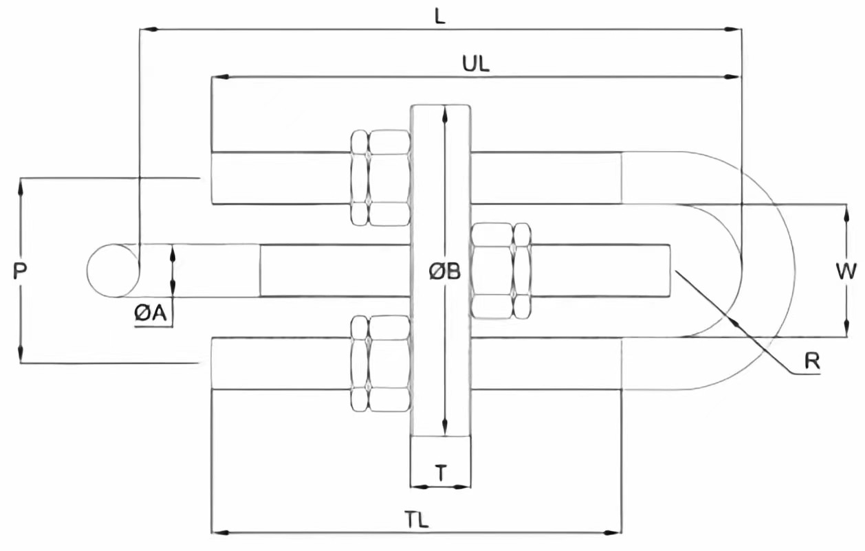 | U-Bolt ΦA | Length L | Chain Size | W | P | T | R | TL | UL | Weight(KG) |