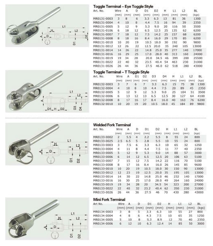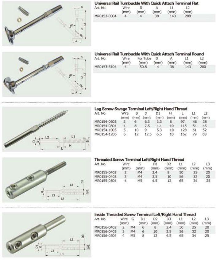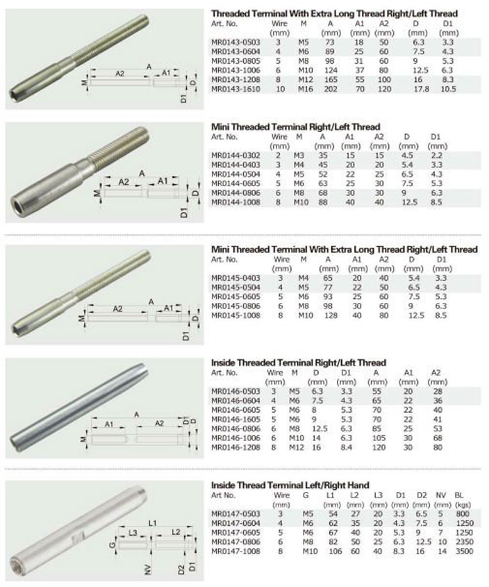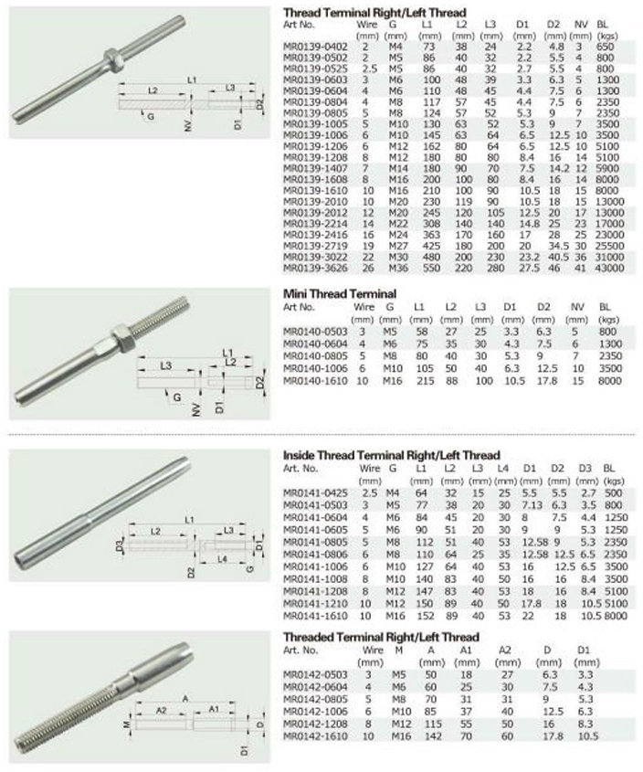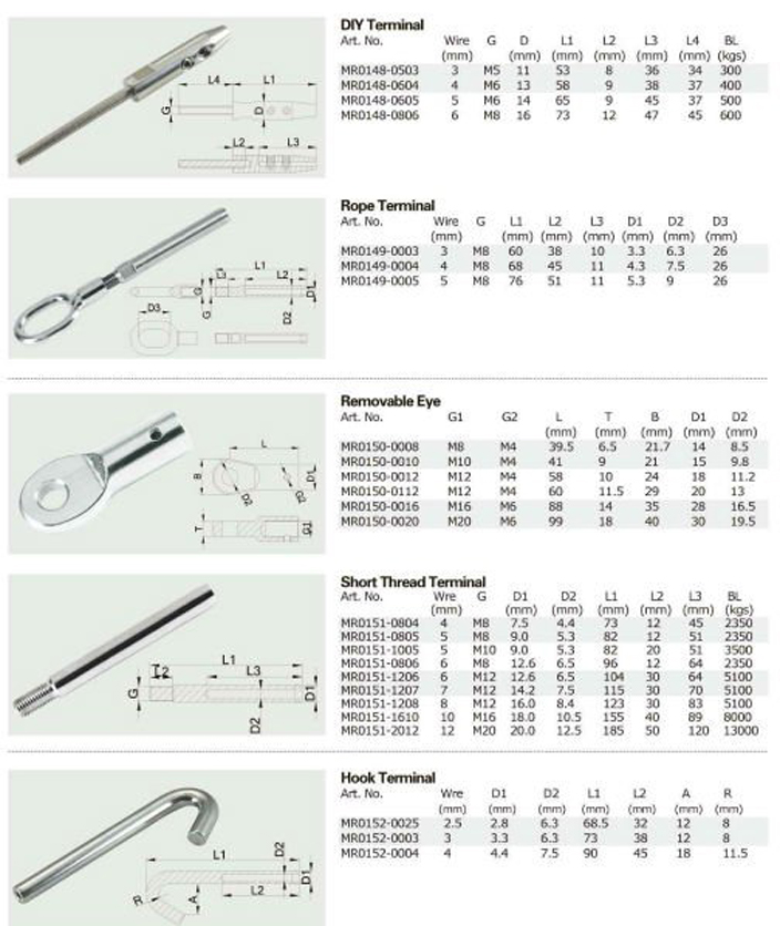 Rigging Screw (closed body turnbuckle), Open Body Turnbuckle, Thread Terminal (swage stud terminal), Eye Terminal, Welded and Machined Fork Terminal, Lag Screw Terminal