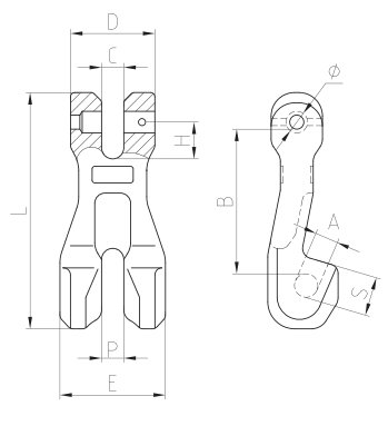 | Item No. | Weight/kg | WLL/T | B.L/T | A±0.3 | B±2 | C±0.5 | D±1 | E±2 | H±1 | L±2 | Φ±0.5 | P±0.5 | S±0.3 |
