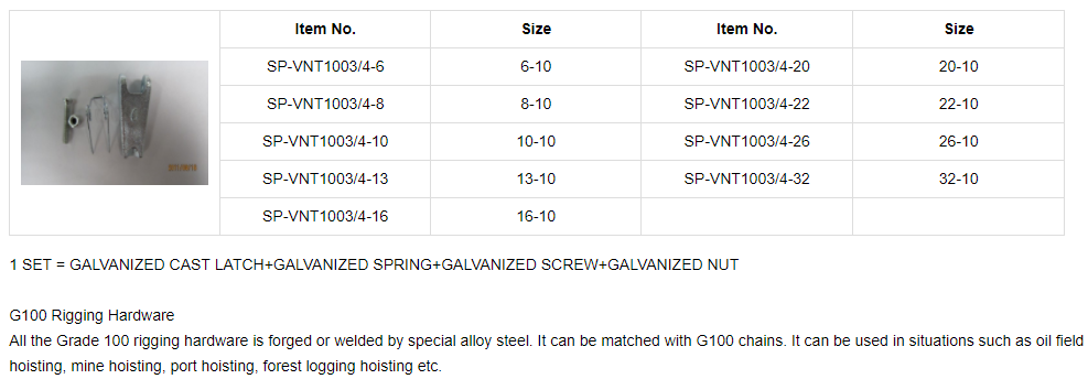 VNT1003 G100 Eye Sling Hook with Latch is a High-Strength Steel Hook with its unique eye shape design and locking mechanism to ensure safety and stability during the lifting process.
