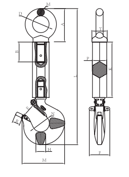 | ITEM NO. | WEIGHT/KG | WLL/T | B.L/T | A | B±3 | E±1.5 | F+0-0.5 | H | M±3 | K±0.5 | P±1 | T±1 | M±0.5 | D | R | N±2 | L±5 |
